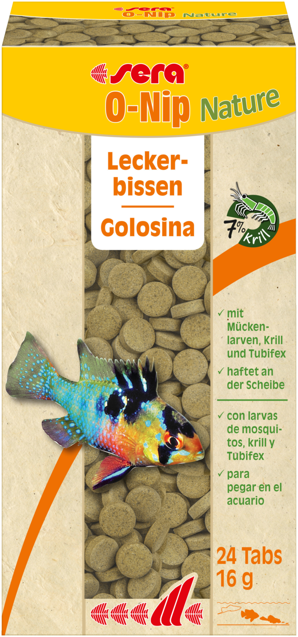 sera O-Nip Nature ist der Leckerbissen ohne Farb- und Konservierungsstoffe aus schonend hergestellten Tabs, die durch leichten Fingerdruck an der Aquarienscheibe haften. So können selbst scheue Fische hervorragend beim Fressen beobachtet werden.
