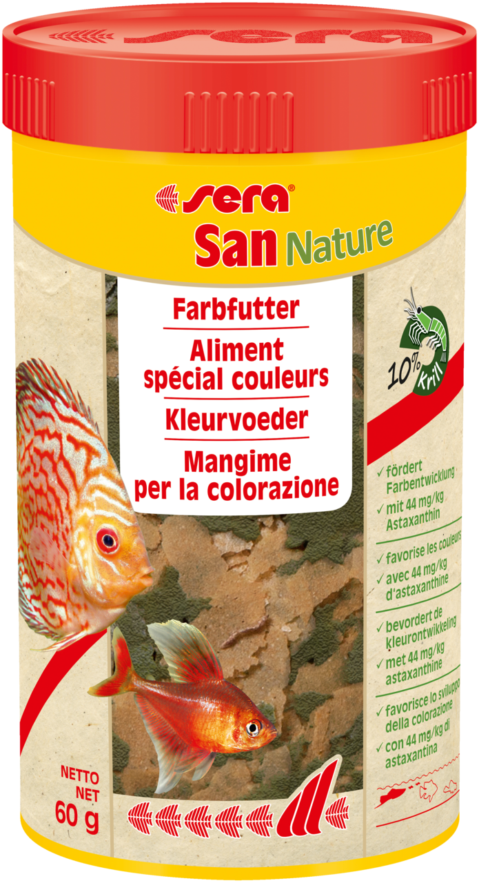 Dieses Produkt zählt zur Produktlinie „sera Nature“, die ganz ohne Farb- und Konservierungsstoffe auskommt. Die Farben der verschiedenen Futtersorten kommen durch die natürlichen Inhaltsstoffe zustande. Eine vielfältige Ernährung mit naturnahen Zutaten ist der beste Schutz gegen Mangelerscheinungen und unterstützt die Gesundheit und die Vitalität der Fische. Aus diesem Grund enthalten die Nature-Futter natürliche Zutaten, wie beispielsweise Spirulina, Krill oder nachhaltiges Insektenmehl aus der Larve der Soldatenfliege (Hermetia). Die Signets auf der Vorderseite der Verpackung weisen auf diese Inhaltsstoffe und ihren Anteil im Futter hin.