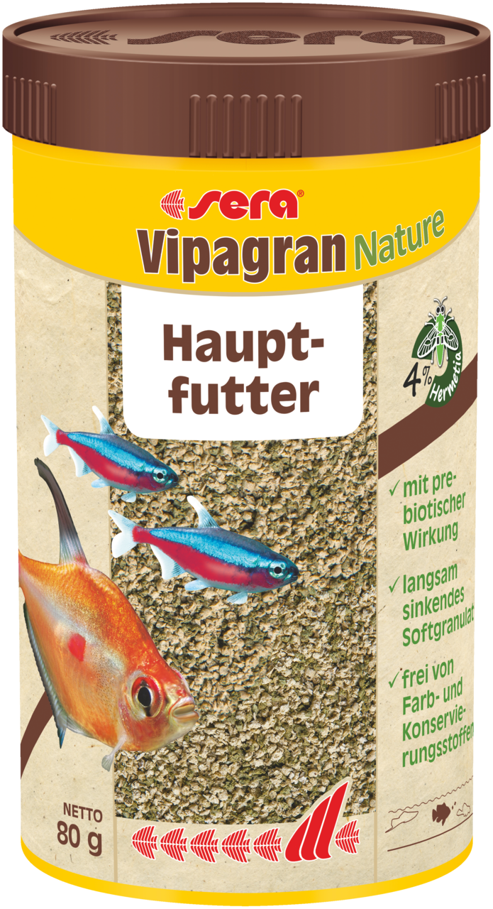 sera Vipagran Nature ist das Hauptfutter aus schonend hergestelltem Softgranulat ohne Farb- und Konservierungsstoffe für alle in der mittleren Wasserzone fressenden Fische. Mit Insektenmehl enthält es eine hochwertige Proteinquelle, die zusätzlich ressourcenschonend ist. Die ausgewogene Rezeptur mit natürlichen Inhaltsstoffen und Prebiotika ermöglicht eine besonders naturnahe Ernährung, die das gesunde Wachstum und eine kräftige Entwicklung fördert.Das langsam sinkende Granulat mit ausgezeichneter Verdaulichkeit ist besonders formstabil und belastet nicht das Wasser. Durch die weiche, geschmeidige Struktur der Partikel, eignet sich das schmackhafte, ausgewogene Futter auch für Fische mit kleinem Maul und engem Schlund.